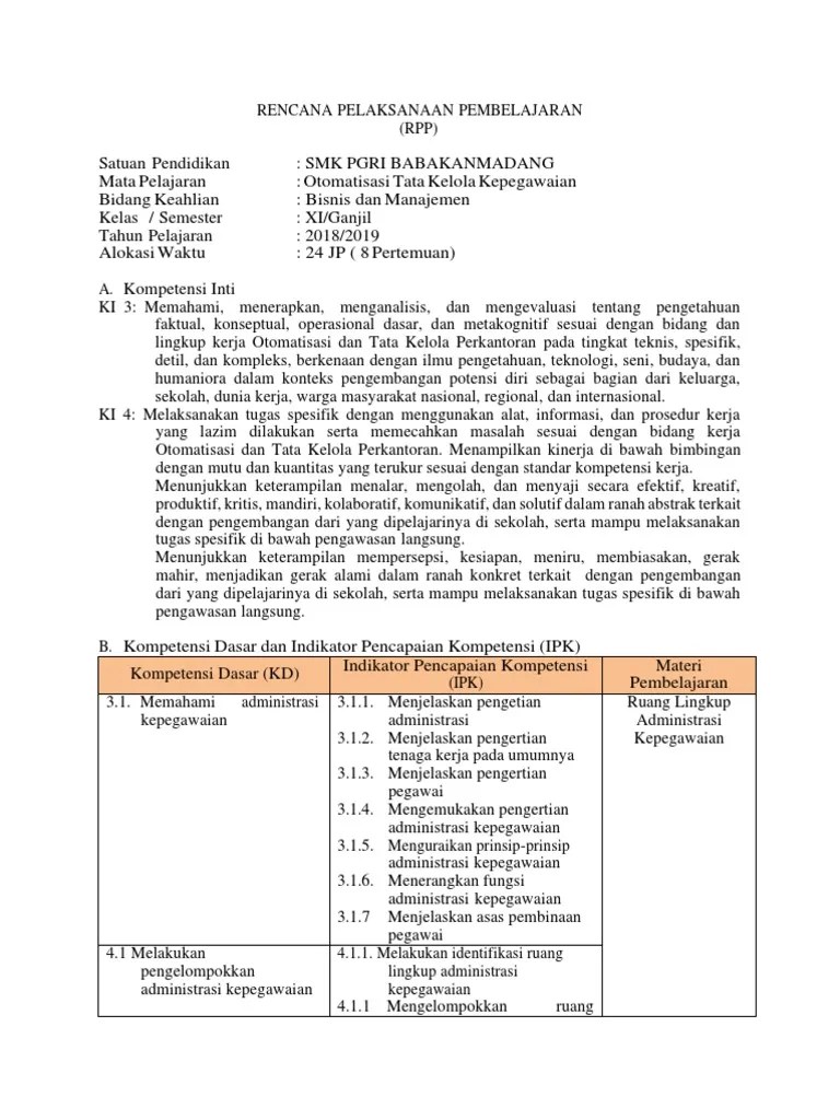 Jun 02, 2016 · berikut ini kompetensi inti dan kompetensi dasar dari mata pelajaran administrasi kepegawaian pada kelas xii dengan 8 jam pelajaran. Rpp adalah sebuah rencana pelaksanaan pembelajaran yang wajib di susun oleh bapak ibu guru, disini terutama mata pelajaran otomatisasi tata kelola kepegawaian. Tujuan kurikulum mencakup empat kompetensi, yaitu (1) kompetensi sikap spiritual, (2) sikap sosial, (3) pengetahuan, dan (4) keterampilan. Mengevaluasi berbagai karakteristik administrasi perkantoran alokasi waktu. Xii kompetensi inti kompetensi dasar ki 1) menghayati dan mensyukuri ajaran agama yang dianutnya 1.1 bertambah keimanannya dengan menyadari hubungan keteraturan dan kompleksitas alam dan jagad… Nah, bagi anda yang ingin tahu menyeluruh seputar materi administrasi kepegawaian. Jan 07, 2021 · rpp otomatisasi tata kelola kepegawaian kurikulum 2013 revisi 2017/2018 smk/mak | rpp 1 lembar 2019/2020/2021 kelas xi xii semester 1 dan 2. Rpp administrasi umum kurikulum 2013 revisi 2017 guru ilmu sosial. Soal sbdp kelas 3 per kd rpp beserta silabus materi garis dan sudut bahan ajar ppkn kelas 11 semester 2 kurikulum 2013 edisi revisi 2017 contoh lkpd. Nov 10, 2020 · silabus otomatisasi tata kelola kepegawaian kelas xii kurikulum 2013 revisi guru ilmu sosial. Download rpp 1 lembar smk kurikulum 2013 revisi 2017/2018/2019/2020/2021 kelas x xi xii semester 1 2 ganjil genap daring lengkap promes prota silabus Kompetensi inti dan kompetensi dasar sekolah menengah kejuruan (smk)/madrasah aliyah kejuruan (mak) bidang studi keahlian : Otomatisasi tata kelola kepegawaian kelas 11 smk by adjat9sudrajat.